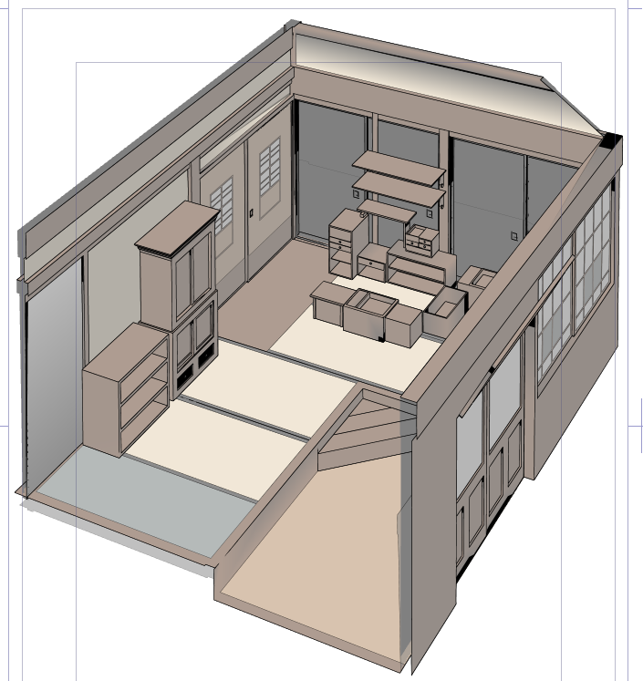 天狗久の工房は、こちらの3Dモデルに様々な小物を追加で描写することで描いております。
